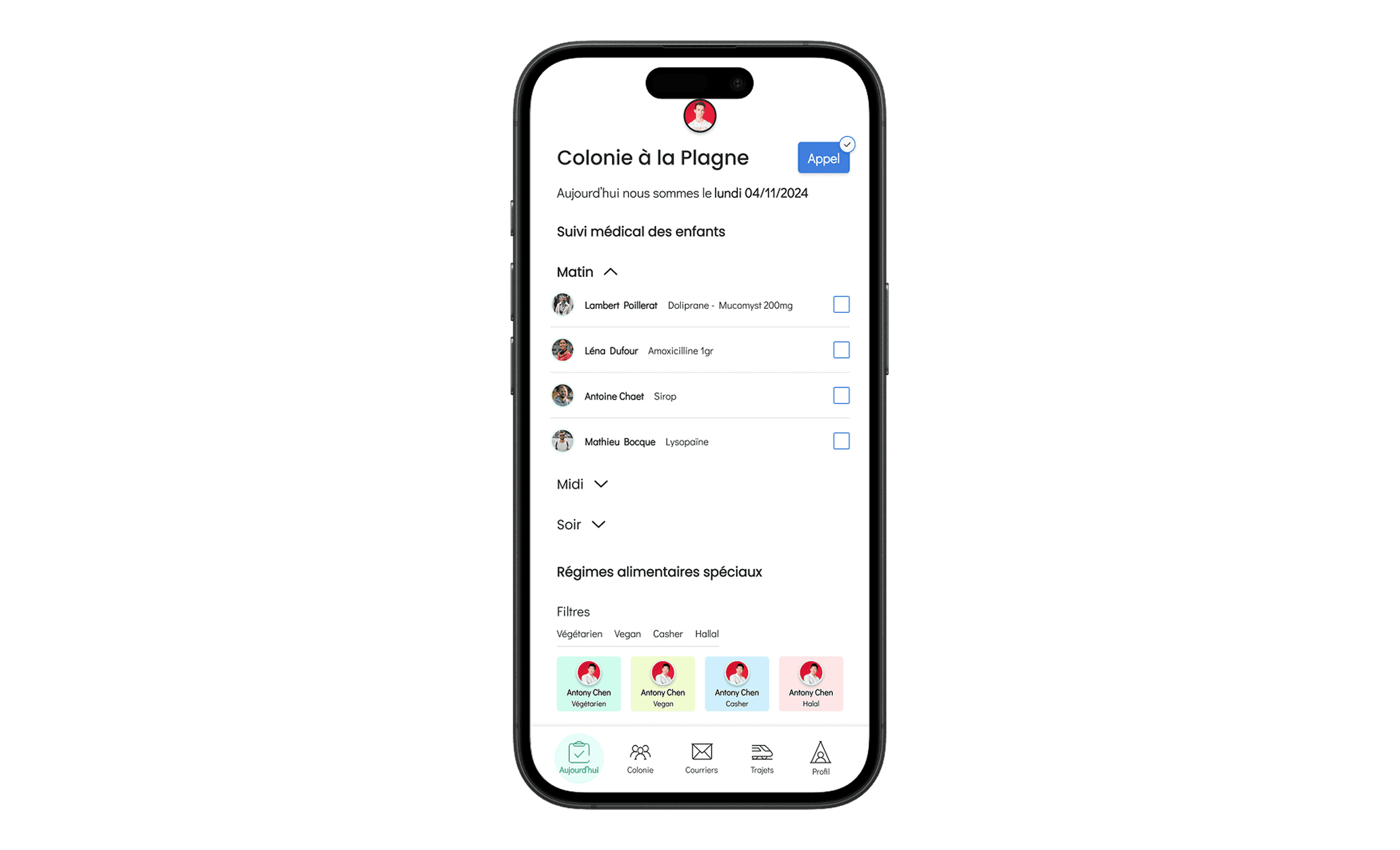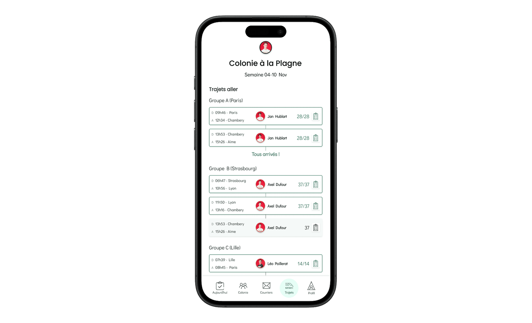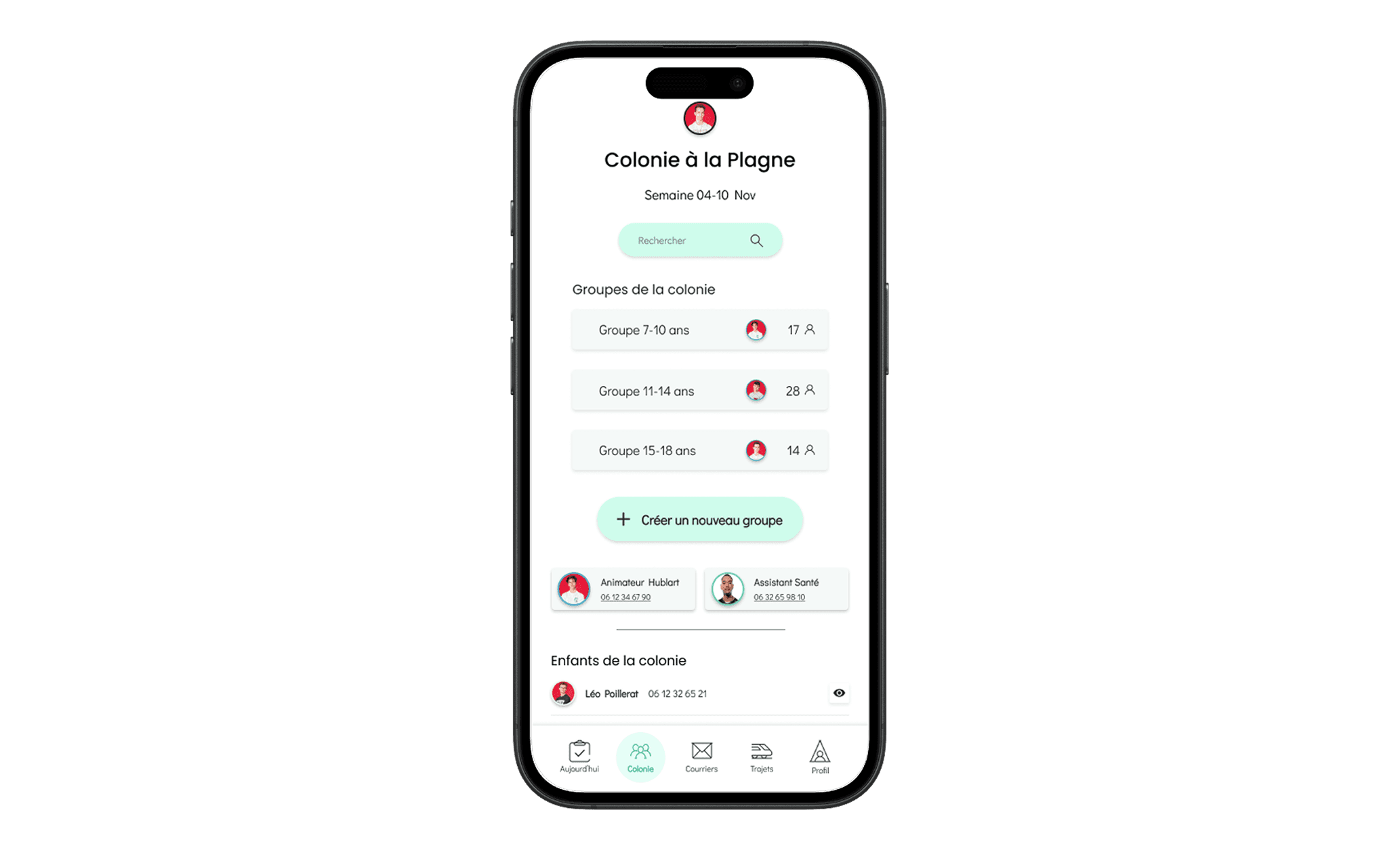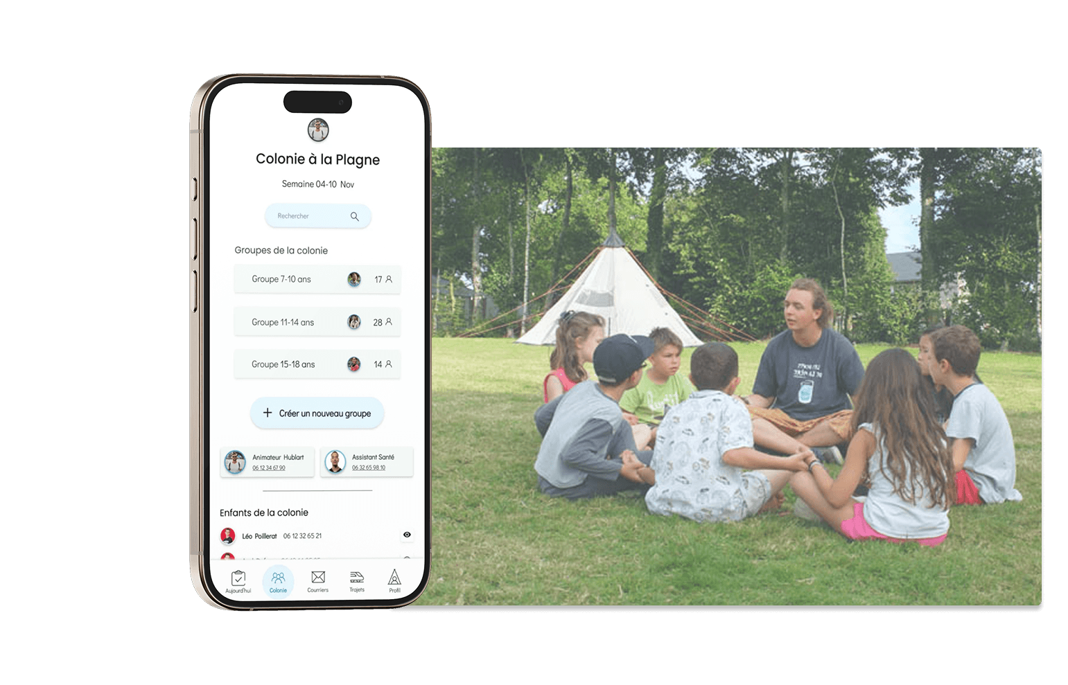 Présences, organisation des groupes, activités et rappels gérés directement depuis l’application.