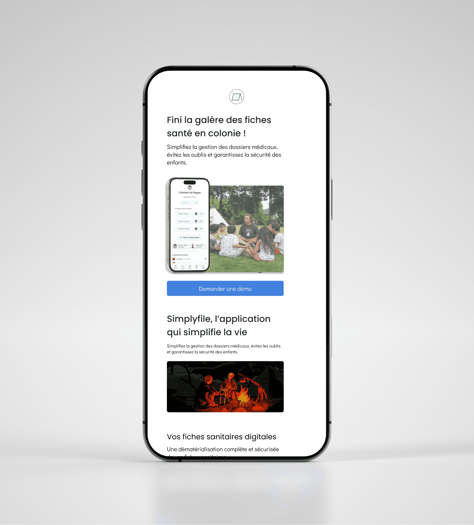 SimplyFile est une application mobile-first conçue pour accompagner les animateurs de colonies de vacances dans la gestion des informations de santé sensibles et des opérations quotidiennes depuis une interface unique.